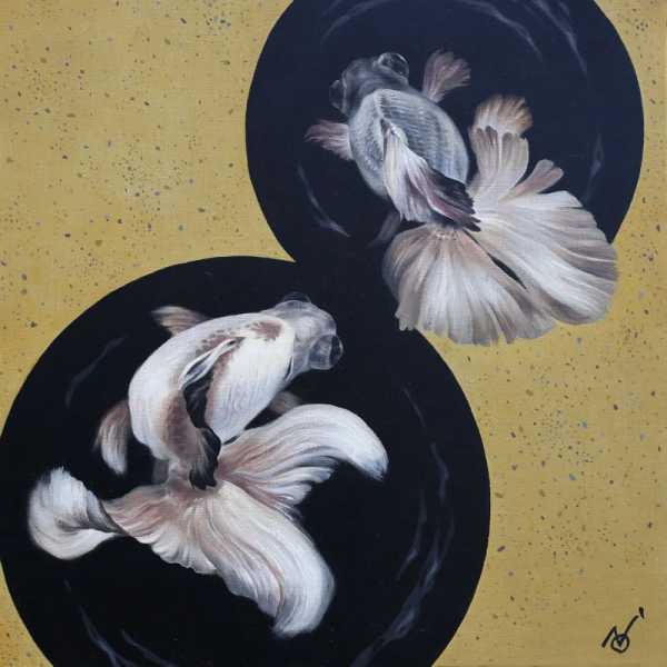 These paintings center on koi and goldfish, subjects deeply connected to Japanese visual tradition. Their movement is gentle and continuous rather than dramatic. The viewer follows curved paths through water, watching repetition and rhythm instead of action.