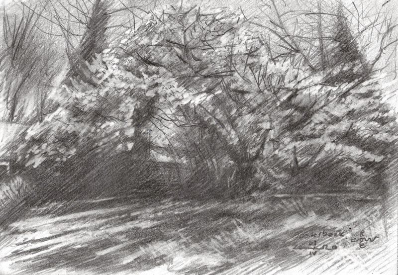 Oosterbeek – 07-04-20 I always find it difficult to draw an impressionistic blossom tree without falling back to depict branches and the blossom in a rather symbolic or linear way. High up the tree blossoms tend to show the same values as the sky and thefore only differ colourwise. Using only black and white makes it only more difficult and that is why I spend more time on this one than the previous drawing. I exaggerated the white in the blossom a little bit whereas I drew a couple of more branches in order to avoid ending up with an amorphous tree in a hybrid play of light and dark around it. I think now the tree showss enough depth of field now. It is a beautiful tree by the way, standing in Oosterbeek Park, near Clingendael, The Hague, Netherlands. Graphite pencil drawing (Pentel 0.5 mm, 3B) on Winsor & Newton paper (14.8 x 10.5 x 0.1 cm – A6 format) Artist: Corné Akkers