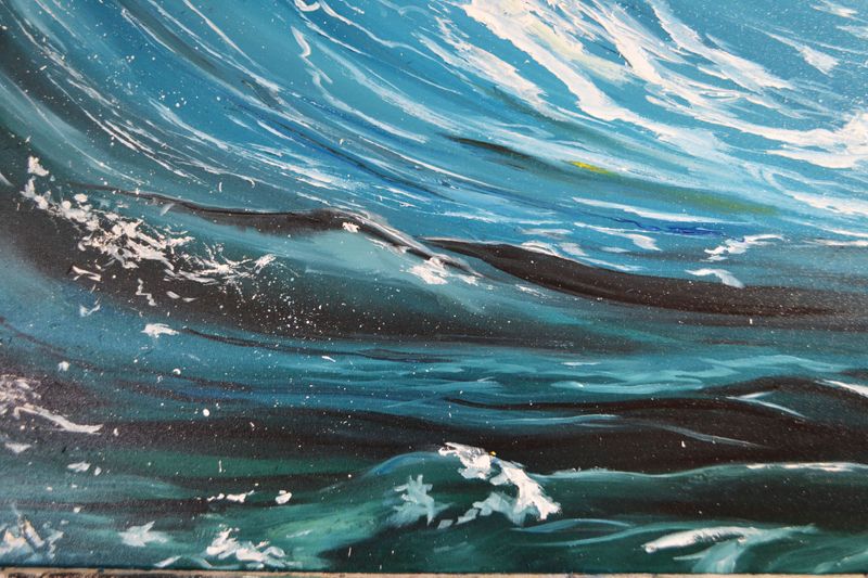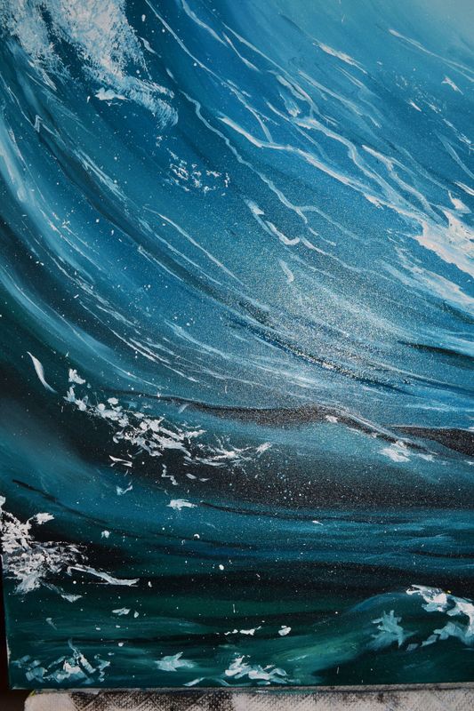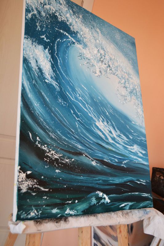 Landscape with a high azure sea or ocean wave. Surf, sea foam, splashes, freshness, ocean shore, beach, azure. Large interior picture. Oil on a gallery canvas, signed and dated on the back. Certificate of Authenticity included. Gift wrapped. Ready to hang. The artwork has a hanging system allowing it to be fixed on a wall. I use all professional packing materials to make sure your artwork gets to you safely wherever in the world you may live.