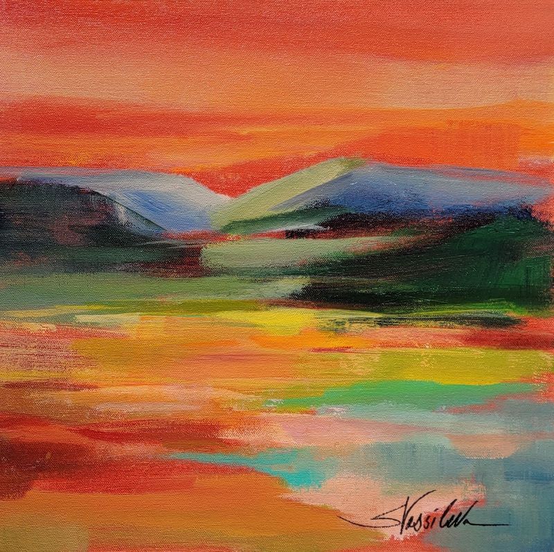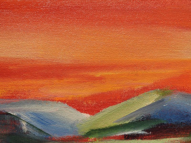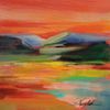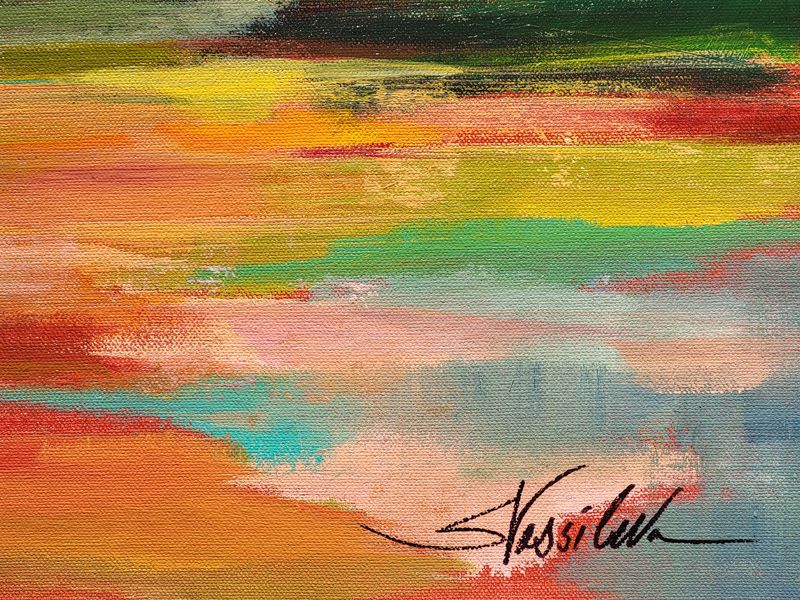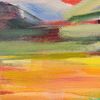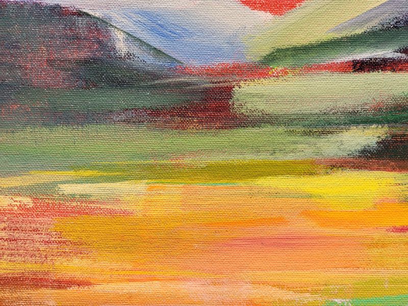 Inspired by one of the most beautiful spots at the Southern California beach - the Flower Hill in Carlsbad - this small abstracted landscape is vibrant and bright. Bold brush strokes, vivid colors and strong contrast create a summer ambience by the ocean without showing the ocean. Primary red, yellow and blue mix in unexpected way and create a rich color palette. The painting is a part of a diptych - it can be displayed alone on a small wall, as a part of a gallery wall or together with its mate Flower Hill Sunset I for a strong impact.