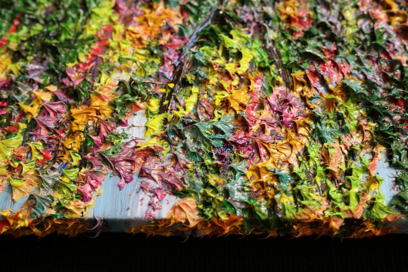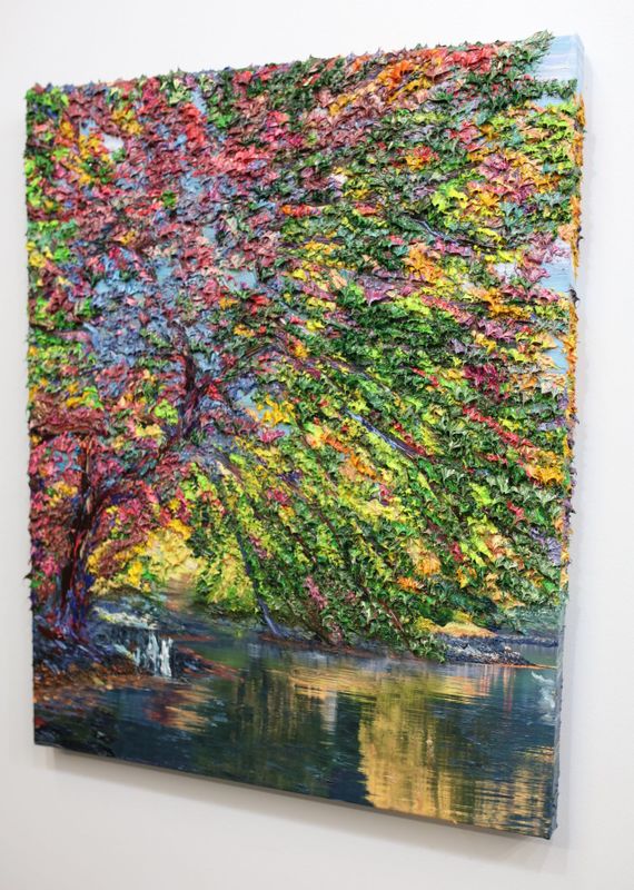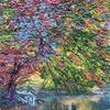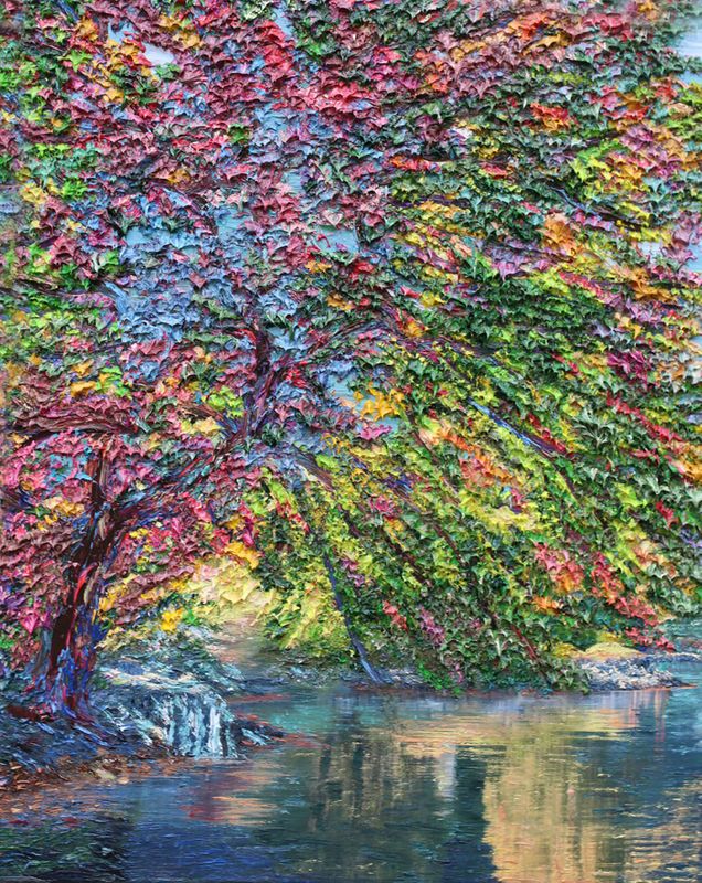 An ancient tree stands proud on an island in a lake. With green, golden, and crimson-hued leaves this proud example of nature points to the movement of time with its subtle but eloquent, four seasons in one tree suggestion. The painting is intended to create a feeling of intrigue as the focus of the eye bathes in the evocative journey of the branches. This enhanced realism painting is executed in Clear Impressionism style in thick oils with bright colors, fluid motion, and engaging texture. Canvas is stretched on a heavy duty 1.5” wide wooden stretcher bar in a gallery wrap style with painting going on all 4 sides, hardware attached and ready to hang.