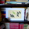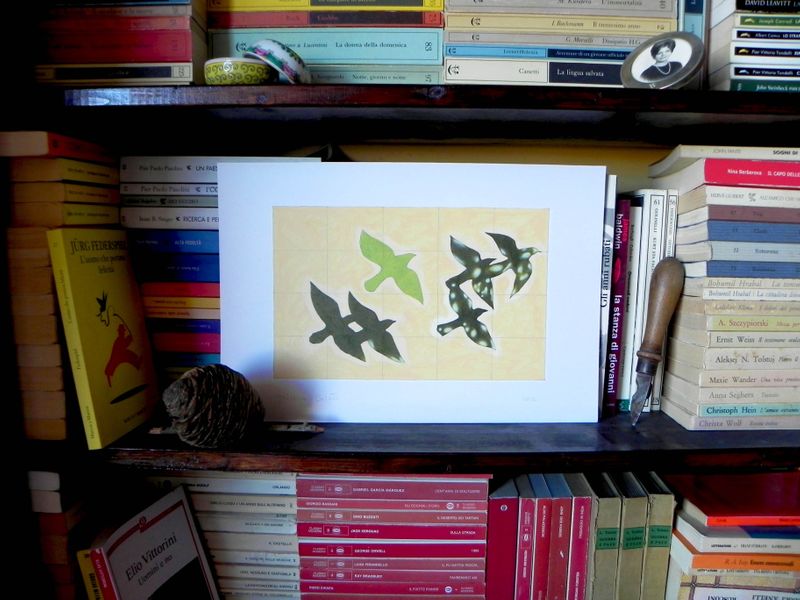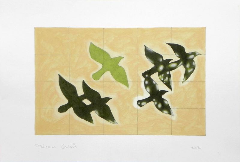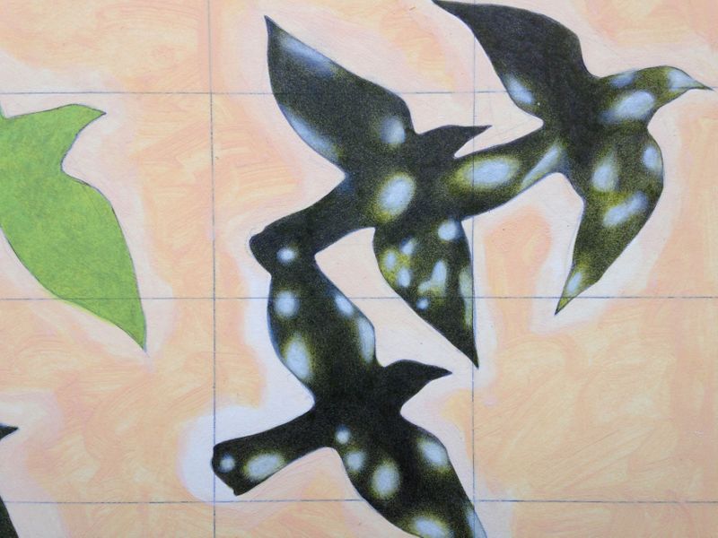An original piece from the series “Point me at the sky!”, oil and pencil on paper, 35.5 x 24 cm (the measures include the white margin), 2012. When I was a young boy I danced like a madman following the tune of an old vinyl of my parents, "Point Me at the Sky" by Pink Floyd. I didn‘t understand the lyrics, I didn’t know that the song was about a pilot that crashes for a fault on his plane. I figured it was an exhortation to take the flight. In the bright contrast of the hot summer afternoons, I saw the black silhouettes ofbirds flying against the backdrop of a clear sky. I saw the leaves of the plantsfiltering the sunlight, and revealing the consistency of their veins and in some cases the shadow of a small frog, motionless, resting on them. To the tune of that song, watching some fish caught in a basin of zinc, I imagined them free and strong in their river, darting happily in the glow of the August sun.
