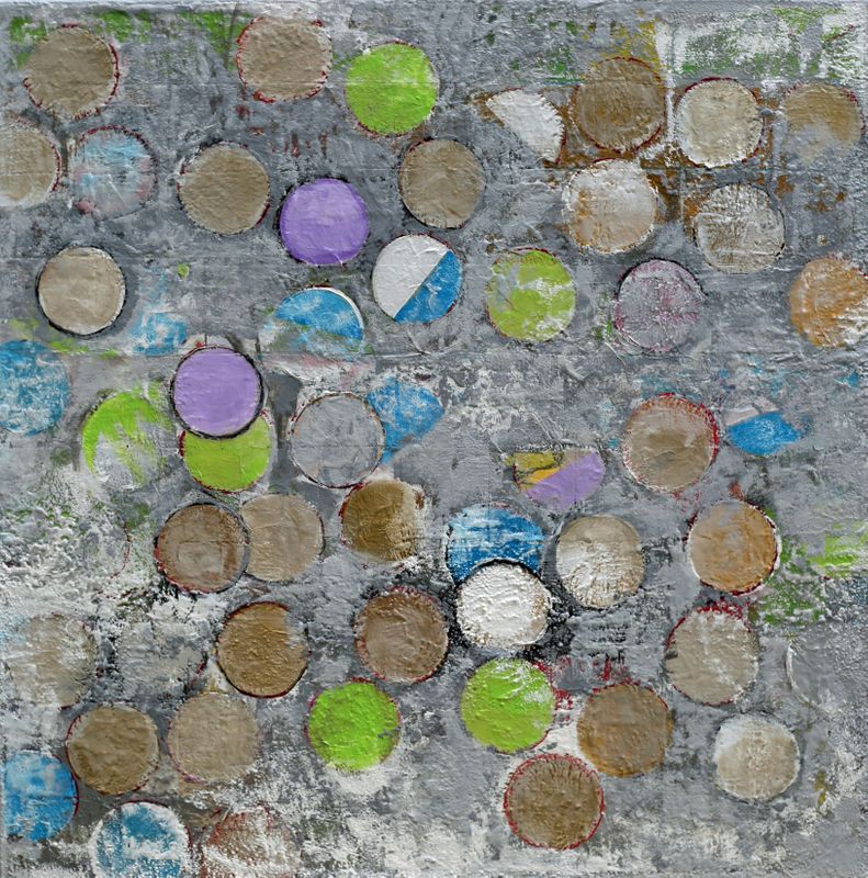 For “Sacred Circles,” I composed a subtle variation of shimmering bronze and gold circles. Then, I thoughtfully placed turquoise, purple, and bright green circles to contrast the warm colors. For the background, I decided on a soft gray. My goal was to accomplish a circle painting that reflected the sacredness of spheres.