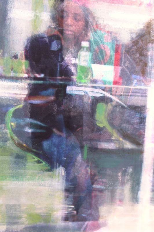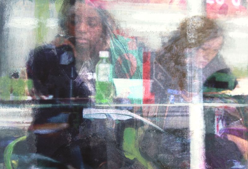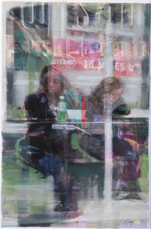 In any city people are busy coming and going. Space and time is at a premium. Observing these two, it is unclear if they are together in this cafe window or just strangers sitting side by side. Either way they seem indifferent to their closeness. The artwork is a combination of original photos and oil paint layers of textures and colors. This adds to the beauty and depth that can be found in the day. The artwork is matted in a custom 16x 20 white mat.