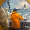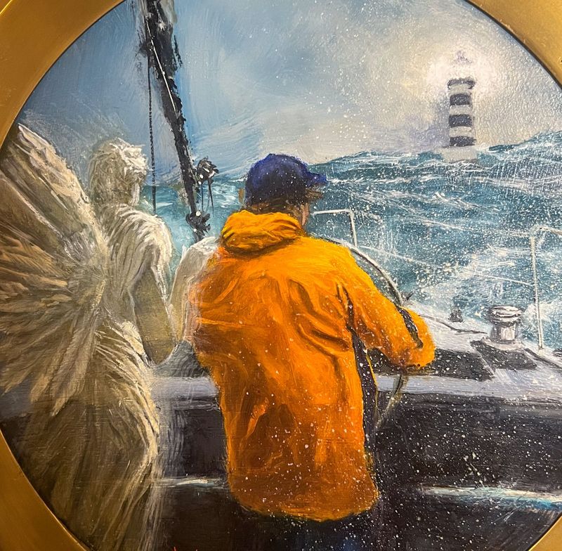 Amid the crashing waves and relentless winds, a steadfast captain navigates the treacherous sea—his hands steady on the wheel, his heart braving the unknown. By his side, a luminous angel whispers guidance, leading him toward the distant glow of a lighthouse—a beacon of hope in the darkness. Framed in a striking 12” bronze porthole, this painting feels like a glimpse into another world, as if peering through the very soul of the sea. Let this piece remind you that even in life’s roughest waters, we are never truly alone. ???? Discover more mystical artworks like this—explore the journey.