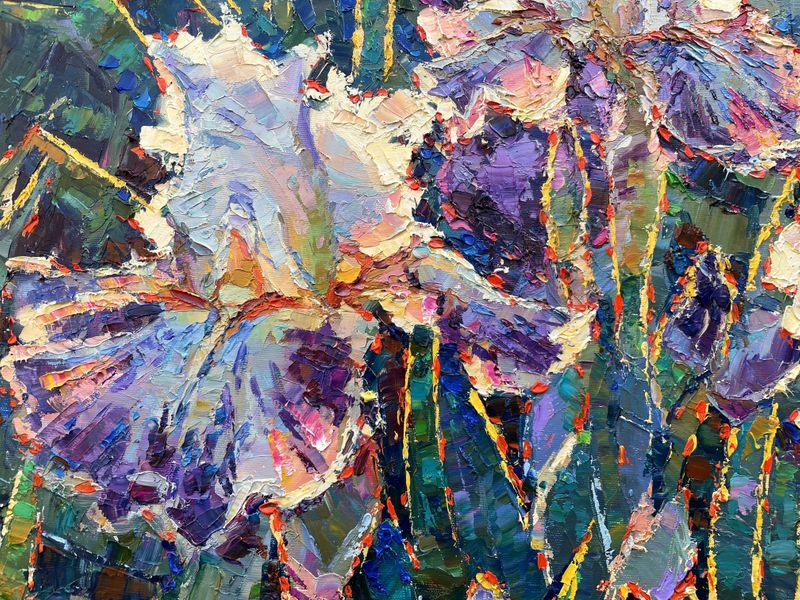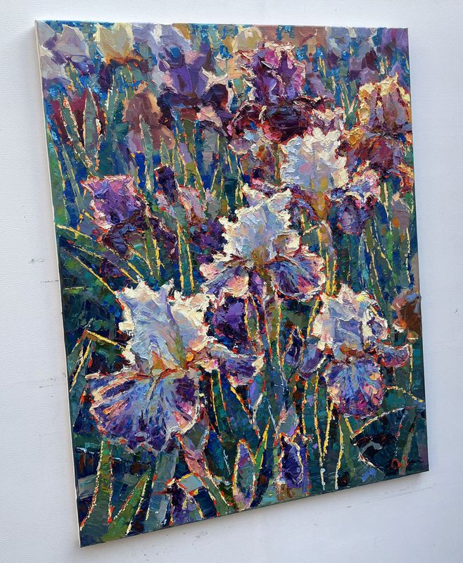 Original Oil painting by Ukrainian artist Evgeny Chernyakovsky "Irises" 65.0 X 80.0 CM / 25.5 X 31.4 IN HIGH QUALITY oil on canvas Signed on the front and back Dated 2025 Good condition GUARANTEE OF AUTHENTICITY
