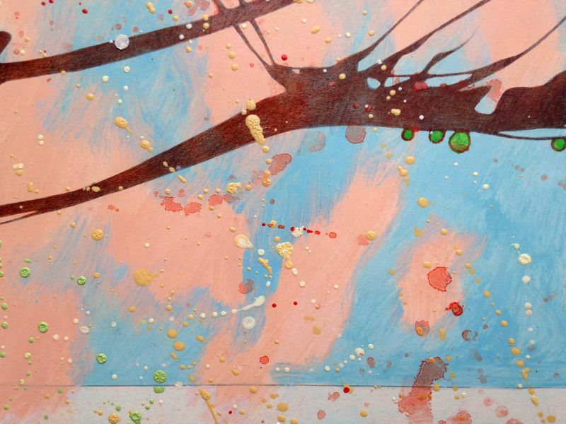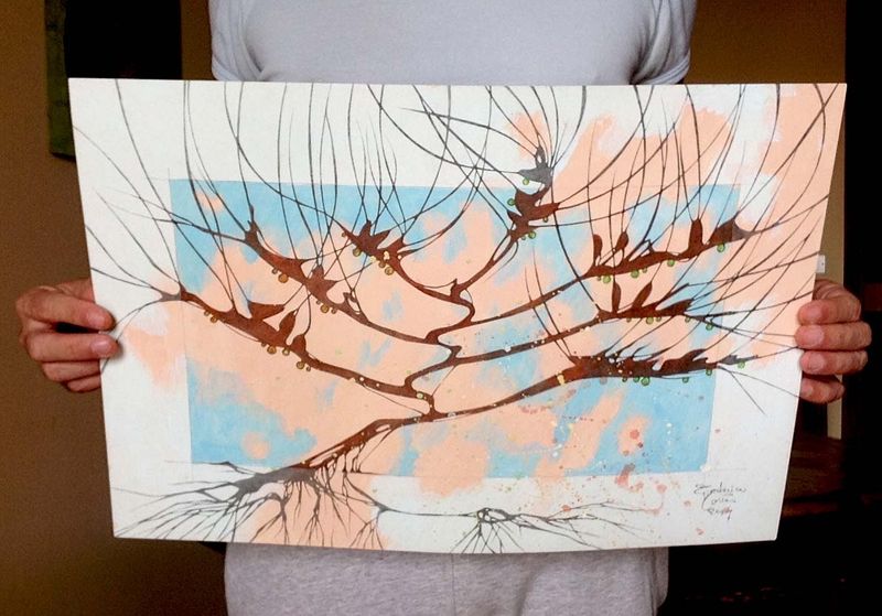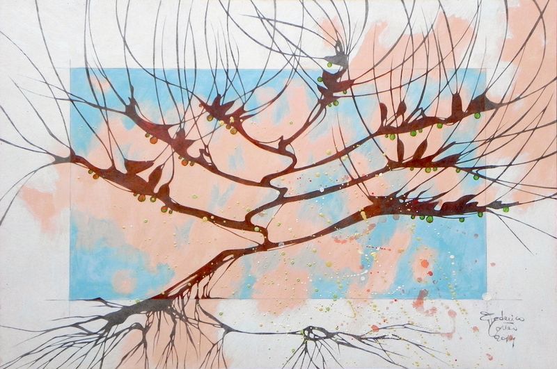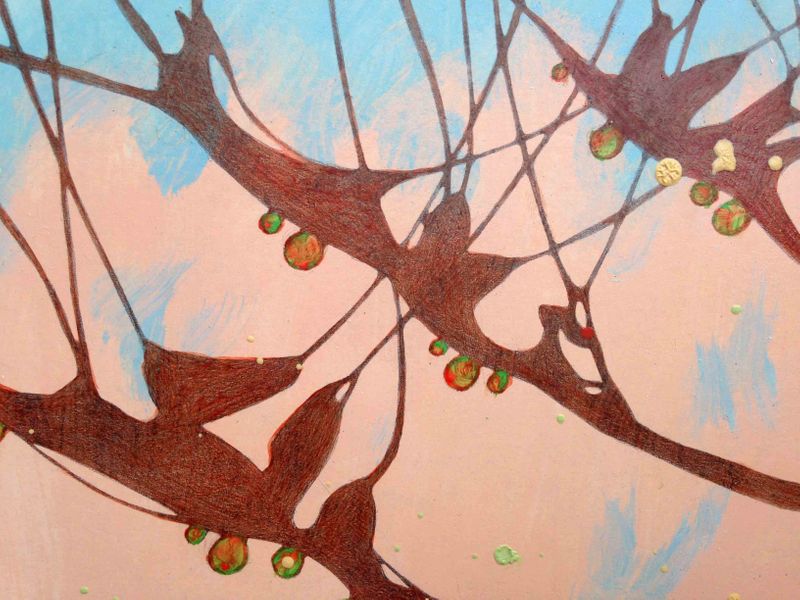 from the series "Withered trees", oil and pencil on paper. 48 x 32 cm, 2014. The structure of a tree is simple and curious: some ramifications in the air to catch the light, some branching underground to pick up the food. But branches and roots are similar: both are developed linearly, until at a certain point, following an algorithm written in the genetic code of the plant, they split, bifurcate, or are tripled, growing in space with a progress which will be sensitive to obstacles of soil or climatic conditions of the place. The drawing of the bare branches and of the roots, flattened by the simplicity of a pattern in pencil, creates an embroidery, an imaginary warping which can be generated countless times, always different.