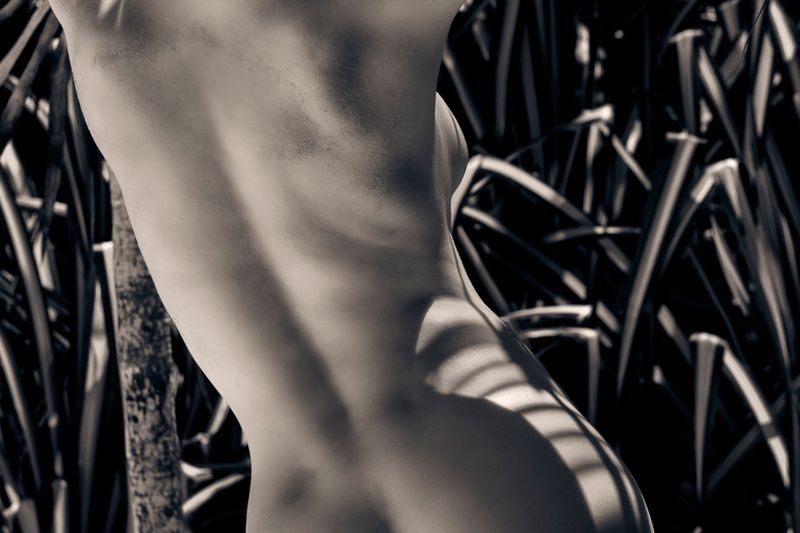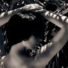 From a limited edition of 5 archival photographs. Signed and numbered by artist Aaron Knight. A near-monochrome composition of woman, leaves, and shadows. Art-ID: PS7_7305