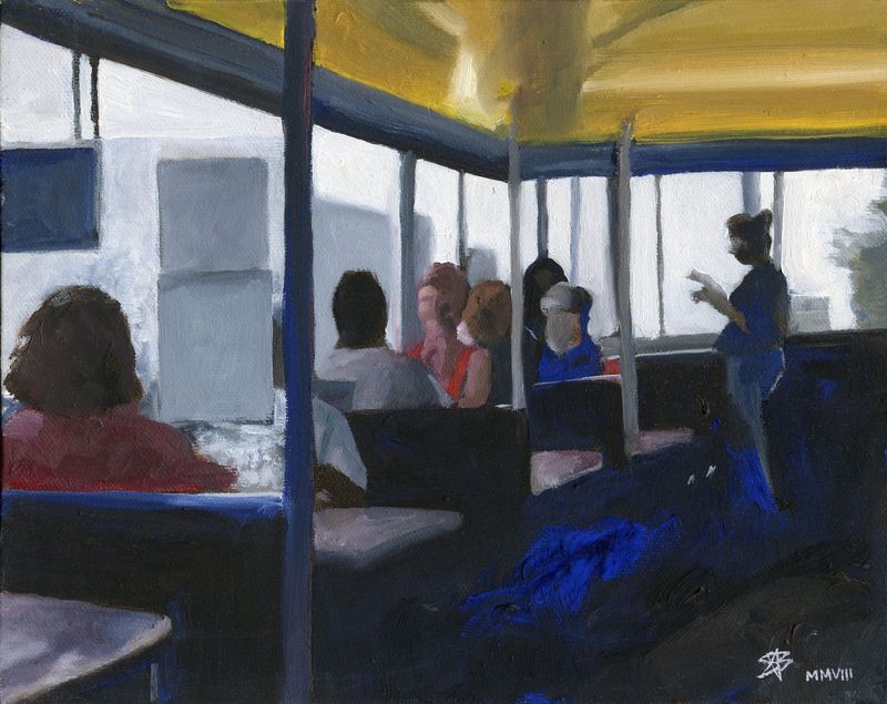 This is an atmospheric scene in a diner, one of my favorite types of public locations, and favorite things to paint. It is a busy scene with the waitress taking an order. The rich blues and unresolved figures against the light of the windows gives it a sense of comfort and generalized familiarity. Oil over acrylic on cotton canvas stretched over pine stretchers, can be hung by the attached wire or could be professionally framed by the buyer.