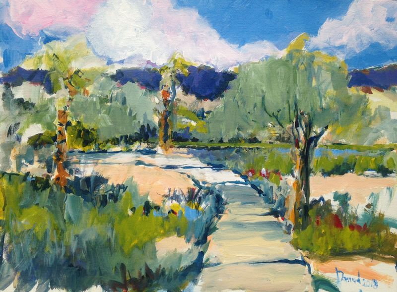 The sun beats down across the California desert walls and its cracked dry ground was hard as a rock. You could see windmills in a distance of the heat wave turning in slow motion as salt seeped from my pores and stung my eyes as I wiped it off. I continued my journey step by step a little closer to home. Palm springs just a few more miles but I knew it would feel like a trip across the world. As I become closer to the melting asphalt of the highway, I could see the herd of tarantula’s scurry across. Amazing the insects that lived within this hell of heat wondering when and how their next prey would arrive. This desert gave no mercy to anything that lived here Yet cactus thrived on the San Bernardino winds that blew. Even with the sun setting, my blood still boiled from the heat and the mountains gave no relief with it shadow bearing across. Coyotes ran across the plain thinking I was their next meal but little did they know I had other plans about retiring. As the night came upon me, so did the cold air through this hollow valley which I traveled. Finally out from its brutal environment, I looked back and realized the beauty in the distant darkness outlined knowing I would take this trip again in time... Acrylic on canvas board